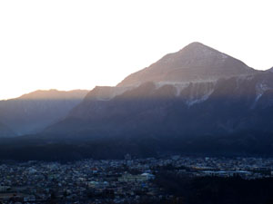 南東約5km先の「武甲山」に朝日が差し込み始めた。擬木階段道で道なり北へ下って |