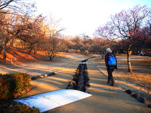 7時7分、車道と並行した園地に「梅園」標識。朝日の差し込む梅園を上っていくと・・ |
