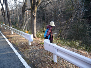 90mほど先の車道のガードレールの切れ目から「カタクリの里」への擬木階段で窪地へ下る。 |