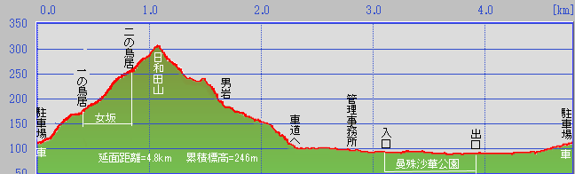 この季節、見ものがあり、且つ3時間以内で周回できそうな山を探し・ 昨年、「巾着田の彼岸花」狙いで訪れた埼玉県の「日和田山」を下山ルートを変えて再訪することにした。 彼岸花の開花状況と天気予報を勘案すると最適日が日曜日になってしまったので観覧者の少ない早朝に「曼殊沙華公園」へ到着するため、登山は日の出の30分前に開始することにした。 ◇所要時間: 2 時間22分 これまでの日和田山の登山記録 |