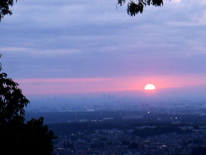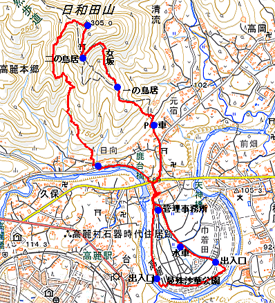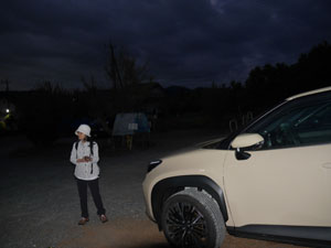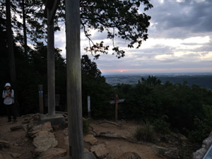 3時25分、出発。 多摩川沿いの県道29〜国道16へ西進して「小荷田交差点」先7kmの「冨土原交差点」を左折・北上。 県道218に繋いで国道299へ合流し2km先の久保交差点を右折。800mほど先の「高麗神社↑」標識に従い左折して300m先のPに駐車(500円)すると気温は20度。 5時7分、ヘッドランプを点灯して「日和田山」目指して出発。 |