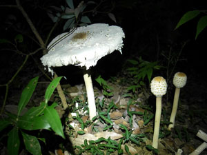 暗いコース脇に大きな「オオシロカラカサタケ(毒茸)」が姿を見せた。 |