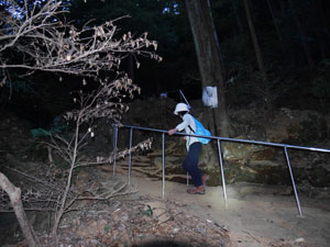 70mほど上った「一の鳥居」先が男坂と女坂の分岐。まだ暗いので「女坂」へ進む。 |