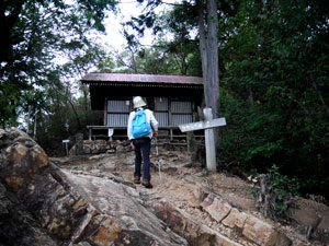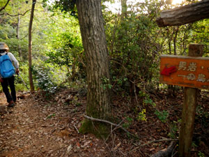 標高約225mに「←男岩・女岩・一の鳥居」標識。これに従い東斜面へ九十九折で下る。 |