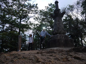 5時51分、「日和田山 305m」に到着。記録写真を撮ったらヘッドランプが点灯していた。 |