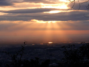 山頂の木立越しに東を見ると朝日の光芒。 先ずは「←物見山」標識に従い西へ30mほど下って四分岐を南へ下る。 |