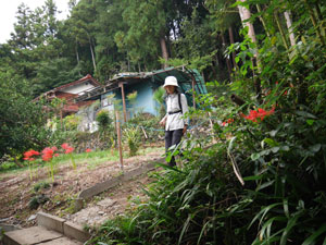 6時40分、森を抜けて人家横へ降りると曼殊沙華。車道で巾着田を目指す。 |