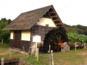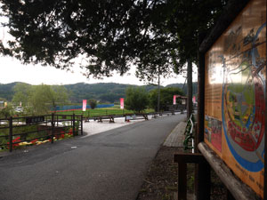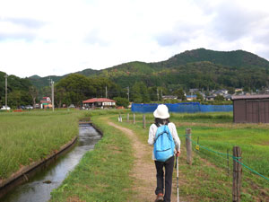 前方に先ほど登った「日和田山」を眺めながら小川沿いに「管理事務所」を目指す。 |