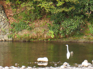 6時49分、「巾着田の管理事務所」横を通過し450mほど先の公園の「出入口」を目指し、「高麗川」沿いに南進していくと・・「高麗川」に白サギ。 |