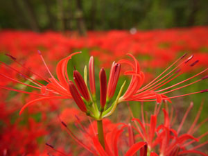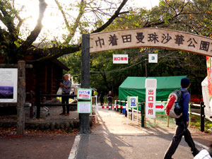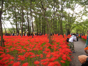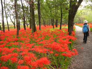 6時55分、「曼殊沙華公園」の入口に着くと 係員が開場の準備中。入場料金500m円/人を支払おうとすると・・料金徴収は7時からとのことでフリーで入場。 |