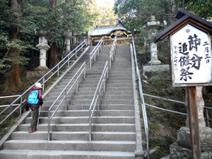 鳥居を潜って今日、「二月三日・節分追儺祭」立て札横の石階段を上り、 |