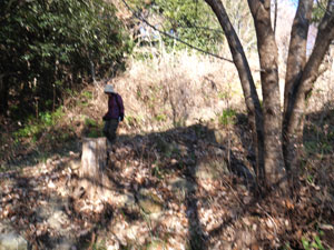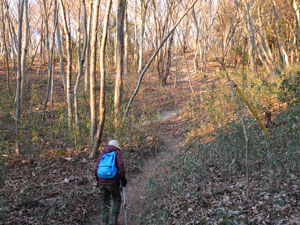 道なり80mほど高度を上げた地点で舗装路をショートカットする山道へ取り付くと・・7時12分、背後から朝日が差し込んだ。 |