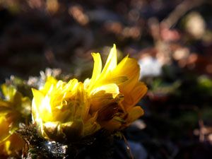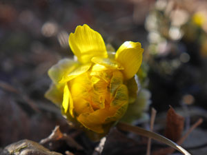 柵の中に黄色の花。喜んで朝日を浴びた「福寿草」をカメラに収める。 |