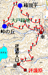 4時40分、出発。 一般道〜県道158(南多摩幹線道路)〜県道47で西進し、 5時33分に「評議原入口」に到着したが・・未だ暗いので「大戸緑地」を先に訪ねることにすると、予定林道・閉鎖で大回りとなった。 6時、「大戸緑地」第1Pへ到着すると未開場。やむなく、第2Pへ移動したがまだ薄暗く、ランプを忘れたので出発できず・・、で、 今回は「評議原のモミジ観覧」だけで帰ろうと往路を戻り、6時30分に「評議原・入口」へ戻る。 |