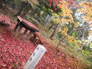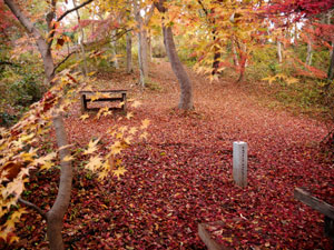 「評議原」の紅葉は盛期を過ぎた模様で林床には一面の色づきモミジ葉。 |