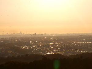 朝日の下遥かに、東京や横浜のビル群が望めた。 |