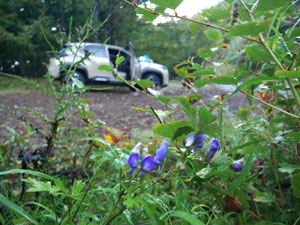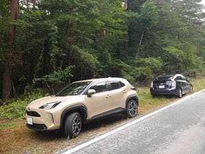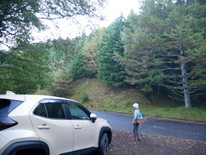 「富士スバルランド」近くの路肩に駐車。 8時48分、道路東の森でキノコ探しを開始。 |