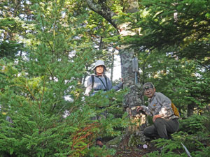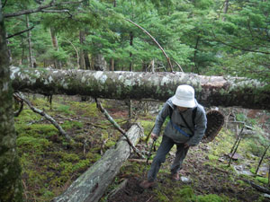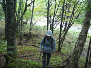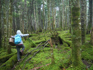 標高1870m辺りまで下ると倒木帯。前進困難なのでキノコ篭は私が預かり下ったが・・気づけば中身がすべて空。拾いに戻る気力が起こらず、諦め下る。 |