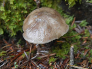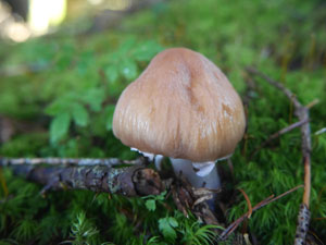 標高1850mまで下ると倒木が減り、楽に歩けるようになり、キノコに目を配りながら下る。この「ウスキモリノカサ」は不採取。 |