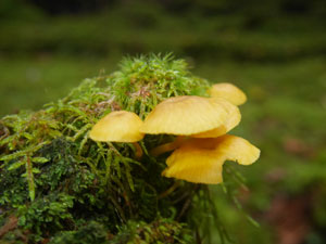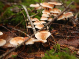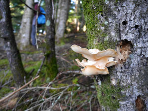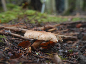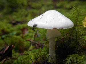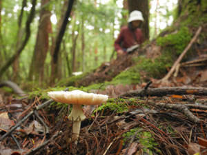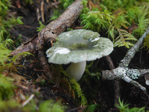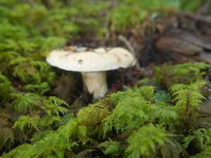 倒木を縫って上っていくと・・湿り苔の中に「シロハツ」。食べられるが旨くないとのことで不採用。 |
