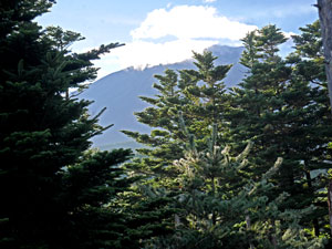 南東の木立の上に雲を纏った「富士山頂」。 |