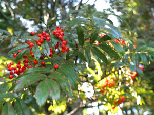 山頂小広場に赤い実の「セイヨウナナカマド」 7時5分、当初予定の上りコースの逆行で下山を開始。 |