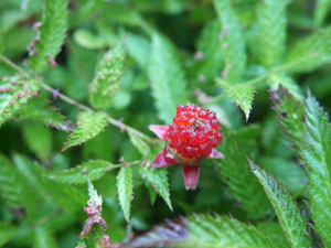 緑の中に赤い実。Googleレンズが「バライチゴ」と表示。 |