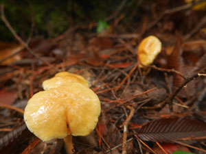 すぐ先で綺麗なキノコ。スマホをかざすとこれも「ヌメリイグチ」との答え。籠に入れる。 |