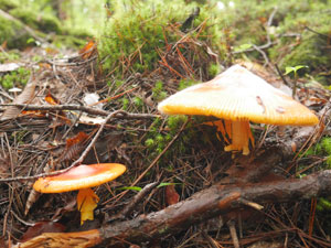 キノコはポツポツあるが狙いの「ショウゲンジ」は早すぎの感じ。これは「テングタケ」、 |