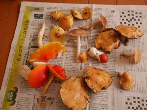 10時50分、無事帰宅。 山麓での収穫キノコはこの程度。(大きな「タマゴタケ」らしいキノコは軸の様子が?で廃棄) |