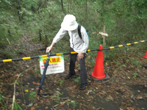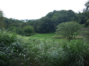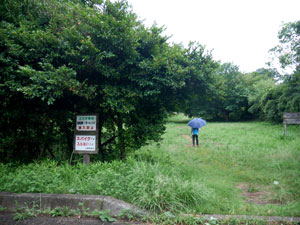 雨がパラついたので傘を差し、「上の原グランド」入口先の「ススキ草地」標識に従い、南の「原っぱ」奥を目指す。 |