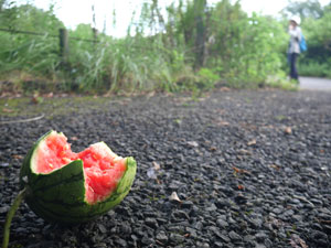 第六駐車場横から「野球場」を目指すと、道路に半分食われた「スイカ」!!。一瞬、熊の噛み残しかと驚いた。 |