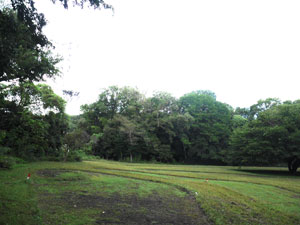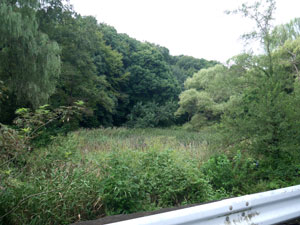 100mほど先で森を抜け出すと右に草原。 |