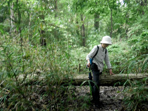 草深い尾根筋の踏み跡で倒木を乗り越しながら辿る。 |