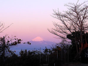 西には朝日で赤く色づいた「富士山」。 |