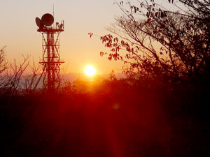駐車場先の「大楠山2.1km→」標識に従い、幅広舗装路を道なり1kmほど進むと・・東の稜線上が赤らみ始めた。 |