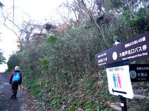 167段、続いて132段の擬木階段道を上ると「大楠山0.5km→」標識。その先の尾根の三分岐まで登ると「大楠山0.1km→」標識。 |