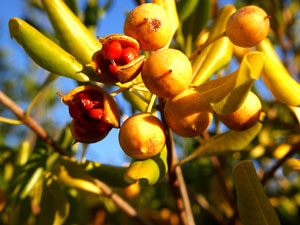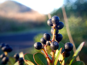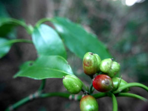 黒紫の実を見せた。(Googleレンズに尋ねると「トベラ」と「シャリンバイ」とのこと) |
