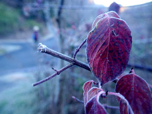 7時25分、階段道を下り終え、寒々しい草原地を緩く上返しながら駐車場を目指す。路肩の植物には未だ霜。 |