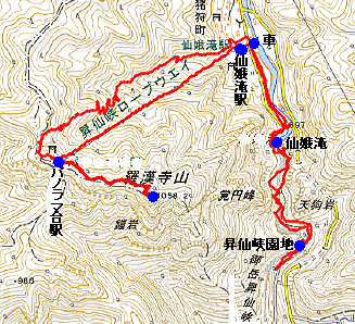 9時12分、ロープウェイが発車し、4分程で「仙娥滝駅」へ下山。 駅前の車に戻って帰路に就き、11時50分には無事帰宅。 |
