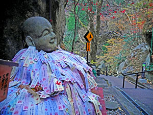 「布袋の願いも三度まで」立て札横に沢山の「願札」を張られた布袋像先の階段を下ると・ |
