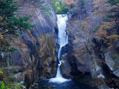 左の渓谷に形良く流れ落ちる「仙娥滝」。早朝の為か、岩肌が良い色合いを見せた。 |