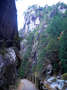 無人の遊歩道を先へ進むと対岸に切り立った「覚円峰」。 |