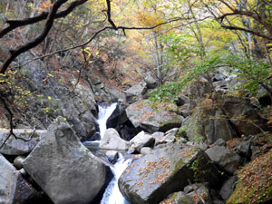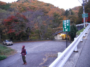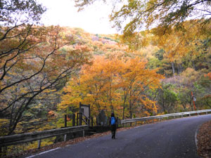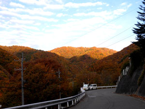 県道218を北へ上っていく。渓谷を覆う樹木の色づきが美しく、最盛期にあたったらしい。 |