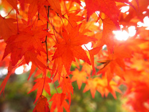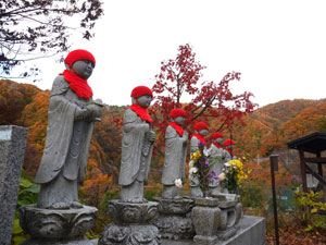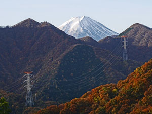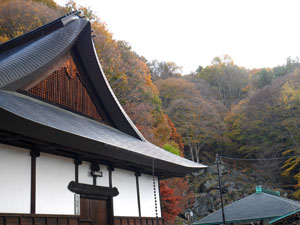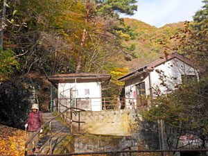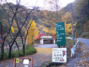500mほど先で無人の「日川渓谷レジャーセンター」横を通過。施設内のモミジの赤、イチョウの黄色が華やか。 |