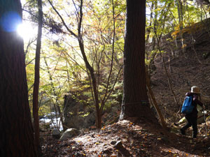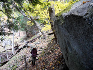 その先暫くは渓谷の崖上を南下。谷底の岩上には落ち葉が堆積。 |