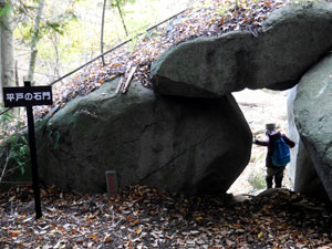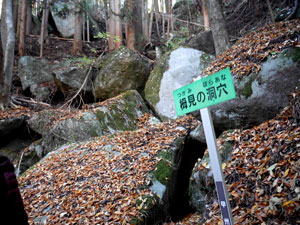 県道から急激に60mほど高度を下げると「栂見の洞穴」看板。その先は落ち葉でコースが分かりづらい。 |