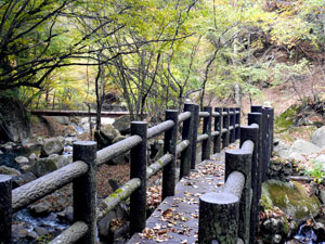 渓谷横まで降りると・・沢側に鎖柵が続くようになった。 |