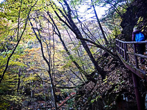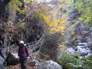 両岸の岩肌が狭まり、沢右岸15m位上に設置された歩道橋で南へ進む。 |