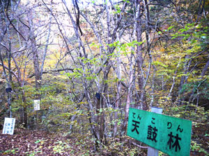 標高880m辺りに「天鼓林」看板。(帰宅後の調べでは「足踏みすると音が響く林」とのこと) |